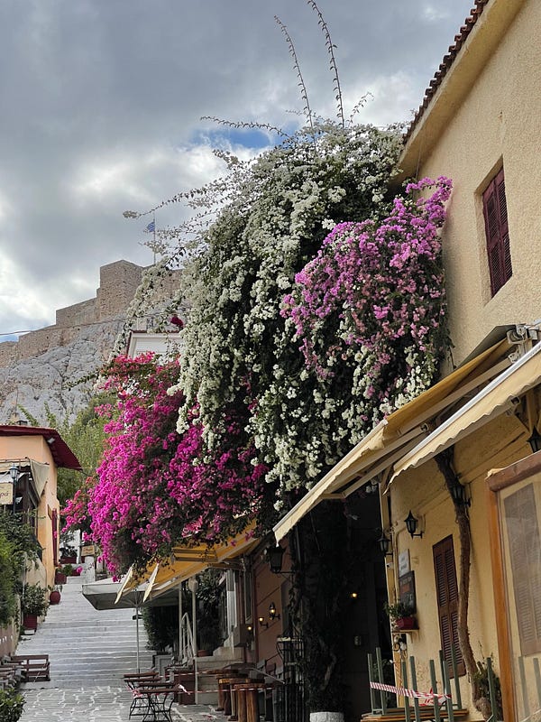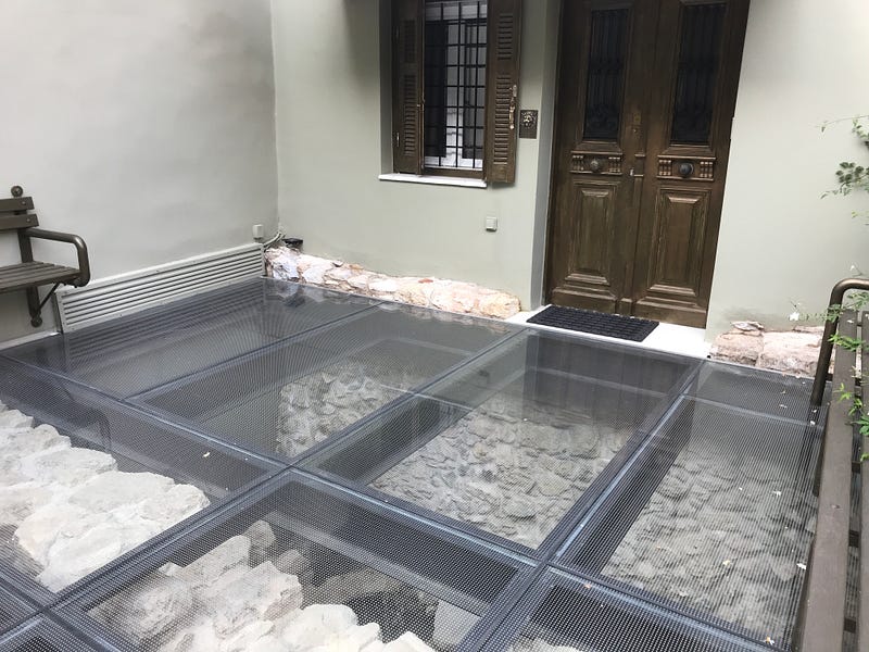 One feature of Athens that we like is you frequently see glass floors to expose ruins underneath an existing property. There really are ruins everywhere here, most streets have some evidence of history on them. In this last week, they were replacing sewerage pipes and discovered a complete bust of Hermes which made it into the local paper.