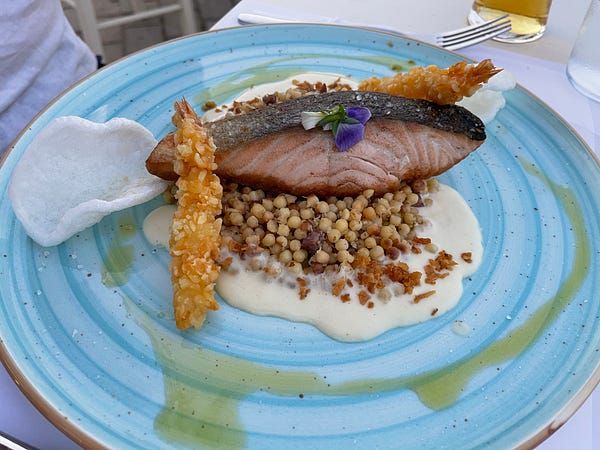 On Sunday night we went to Porto Heli for what’s probably one of the nicest meals we’ve had in Greece. A couple of very fancy fish dinners that were very enjoyable. I had the salmon with Wasabi and Karina had the tuna with cous cous.