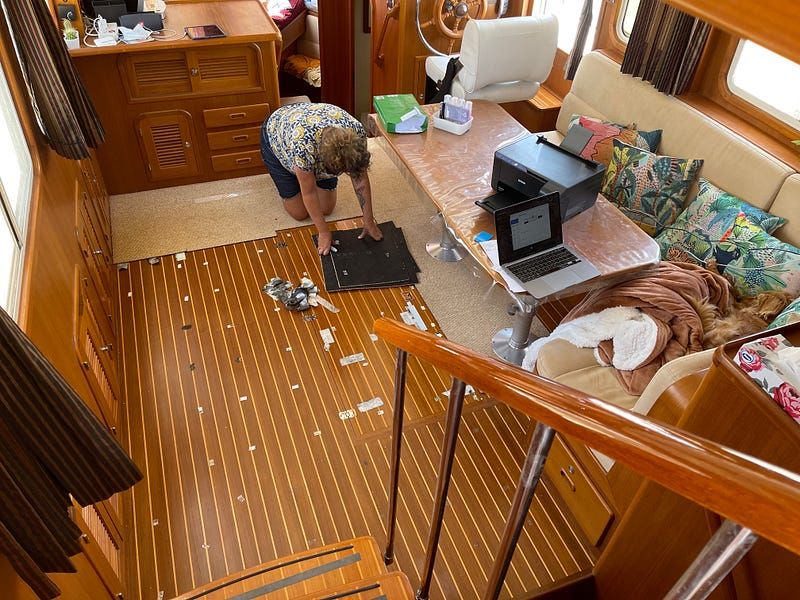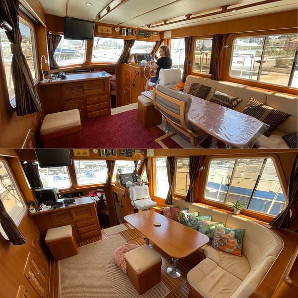 Last week when I left off we were on the boat and doing chores. That kept us busy for quite some time. Karina pulled up all the carpet and carpet tiles in the salon and after a lot of trial and error, found the right combination of products that would remove the sticky spots left behind without destroying the floor. Turns out that furniture polish works perfectly! It also involved finding the cordless drill on the boat (we knew we had one, but which of the 20 cupboards is it stored in!) and then of course charging the batteries in order to also remove the table to get rid of the last few carpet tiles which were screwed down. As you can see in the before and after photo, the boat has really lightened up a bit and feels more like us now.