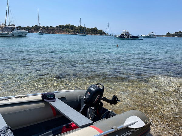 We’ve decided that (because boat maintenance is essentially endless) we need to keep aside one day for doing nothing. Given everything is shut on Sunday anyway, we’re trying to make this our day off. This meant a good excuse to break out the tender. The goal — a trip to the beach!