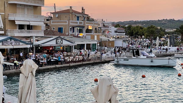 Last Sunday we were still in Porto Heli, which really is a very picturesque little town with a lot of great places to eat. There’s a definite buzz at the moment as the movie “Knives Out 2” starring Kate Hudson and Daniel Craig is filming on Spetses Island, (about 2 miles off the coast) and the cast and crew are all living in villas around the Kranidi peninsula. The town is full of black Mercedes vans couriering people around and the crew fill the cafes. We overheard several crew members gossiping about the stars, who they liked to work with, what you’re allowed to call them, that sort of thing.