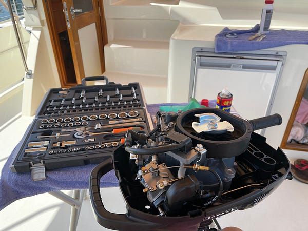 It was strange — many of the parts in the motor were obviously familiar (choke, throttle cable, air intake etc.) but it didn’t seem quite the same as the video either. I put it down to the fact our outboard is a little more recent than the one in the video, so they’d probably tweaked the layout. Never mind, I got it apart, cleaned, poked and prodded and then put everything back together again, only to realise at that point that our outboard is actually Suzuki and all my “research” and learning had been watching videos on Yamaha’s 🤦♂️.