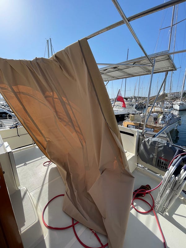 - To access the solar panels, the safest/easiest way is to remove the cockpit bimini (canvas cover) so you can stand on the back of the cockpit seat and clean them. Start removing the bimini.