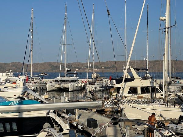 Lavrion Olympic Marine is a very different marina from Porto Heli. Porto Heli is a bit more “upper crust”, very focussed on the tourist trade with the majority of guests coming and going after a day or two. Lavrion is a working marina— lots of permanent moorings, a big charter base so lots of charter yachts and people coming and going for that as well as a lot of people who are living on their boats like us.