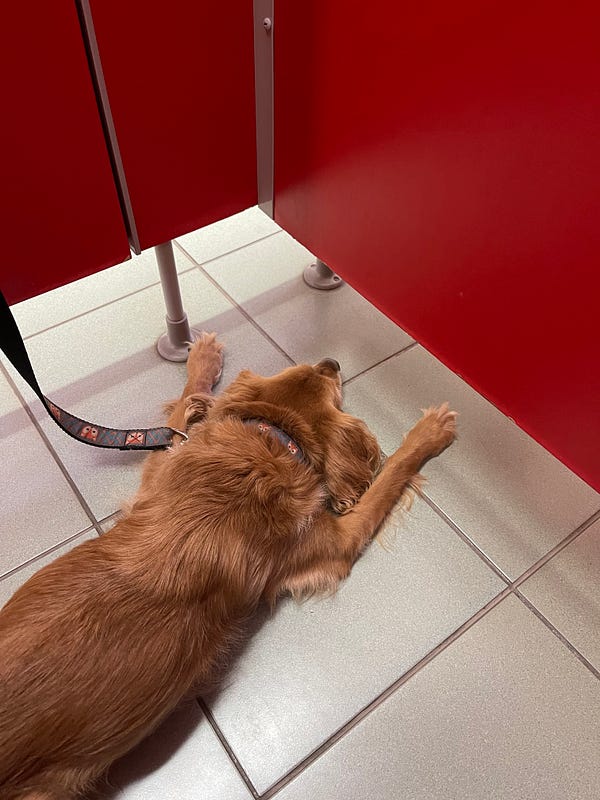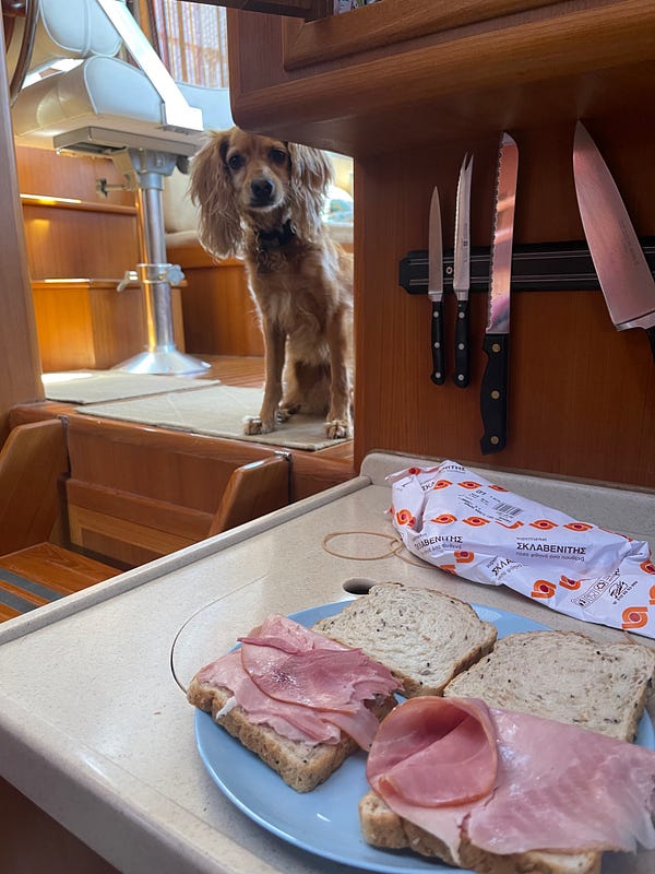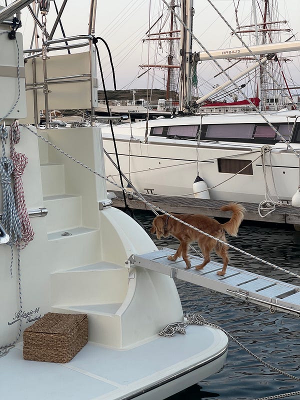 As we’re so busy on the boat, finding time to get out and walk her is a challenge — there’s also not a lot of great places to go inside the Marina, so one thing we do is take her with us to the toilet when we go, which is about 400 metres away from the boat. Because there’s a lot of stray dogs around, we bring her inside with us (it’s Greece, it’s OK!), and the cleaning ladies love her. She likes to sit and peer under the cubicles which can be a little disconcerting when she makes friends with someone next door, or (more commonly) the cleaning lady wanders in (to the mens as well) and has a conversation with her while you’re on the toilet.