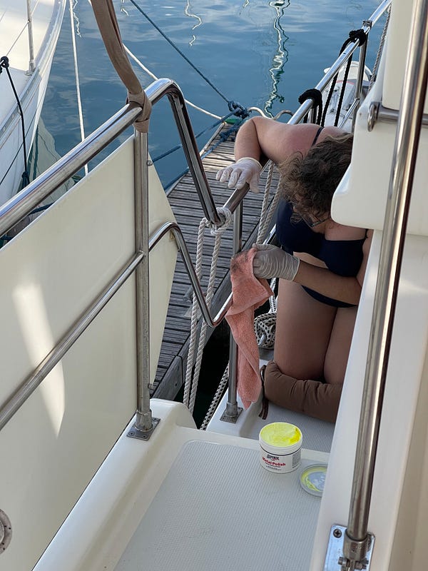 Good progress has been made on polishing the stainless steel, particularly after we discovered an acid gel onboard left by the previous owners which works a treat! You paint it on, let it sit and rinse it off, rust is gone! Of course you shouldn’t spill it on your clothes as they’ll fade / get holes… don’t ask me how I know this…