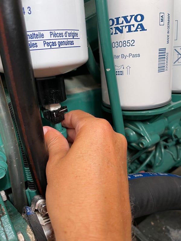 We have racor pre-filters and then the main filter on the engine itself, so I learnt how to clean and drain both of those and afterwards the error had gone and everything was fine again. The question of course is how does water get into the fuel, well this is a apparently a bit of an issue with boats — I think mostly because they have such large tanks, the diesel contains some condensed water in it, but over time it settles out and separates into a layer of water and diesel in the tanks. After a rough crossing (like we had last week) the water gets mixed back into the diesel and the water can get into the engine. It’s not that unusual, it really means that come winter during our haul-out, the tanks are due for a big empty and clean.