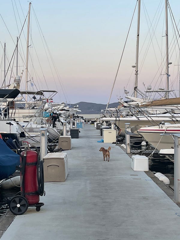 Last weekend many of the boats were out around us, but no one has gone out this weekend. A couple of people visited, but they all stayed in the marina. Even the charters are constrained — people have paid good money to go cruising in the Mediterranean, so this weather is very inconvenient. Last night when we were walking the piers with the dog, most of the charter guests were sitting on the dock, not on the boat, just because of the movement making them feel sick.