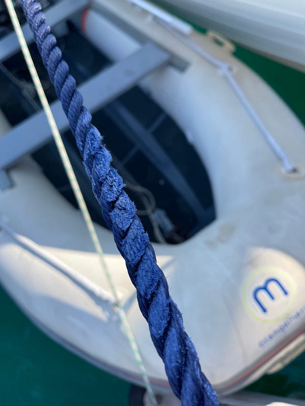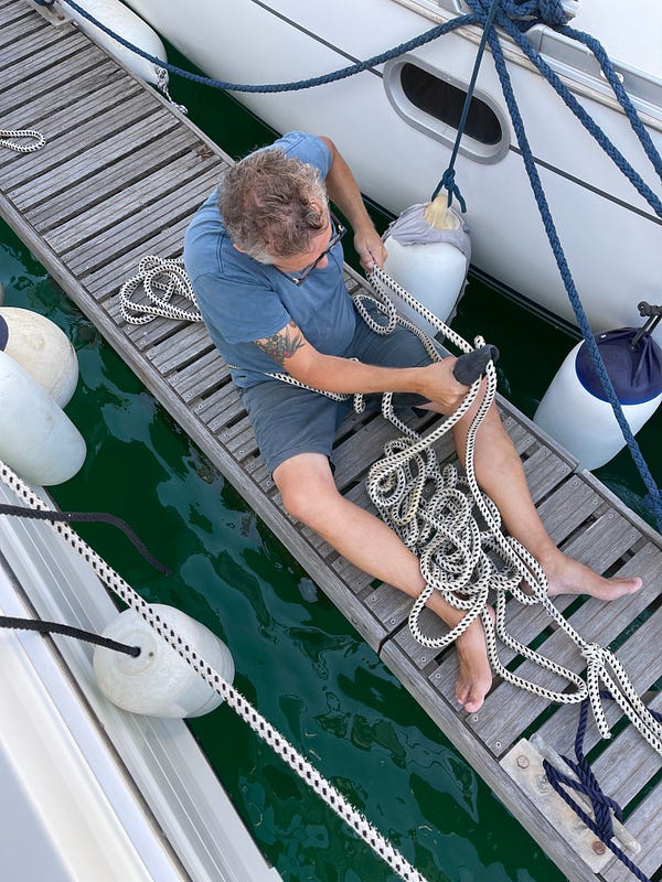 I said at the beginning that the wind is destructive — I’ve now got into the habit of checking the dock lines three times a day and that “emergency” one I fitted on Thursday? Turns out it was a nylon rope and within only a day it had already melted about a third away due to the friction. I dug around to find the proper dock lines and then fitted some rubber snubbers to absorb the shock load.