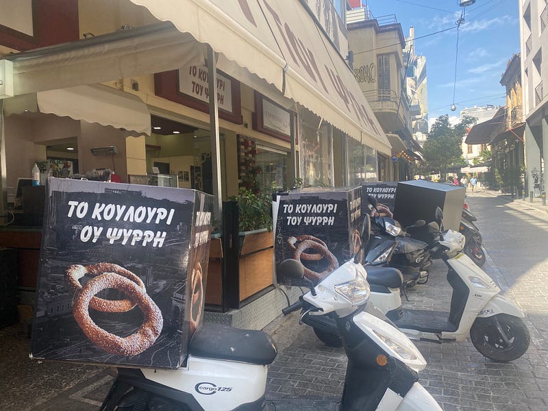 Thursday through Sunday mornings are punctuated by the sounds of suitcases rolling over cobblestones, typically early in the morning — people arriving from their flights for their weekend getaway in Greece, or checking out to head home or early to head for the ferries for their island getaway. You don’t hear much of this Monday — Wednesday at all.