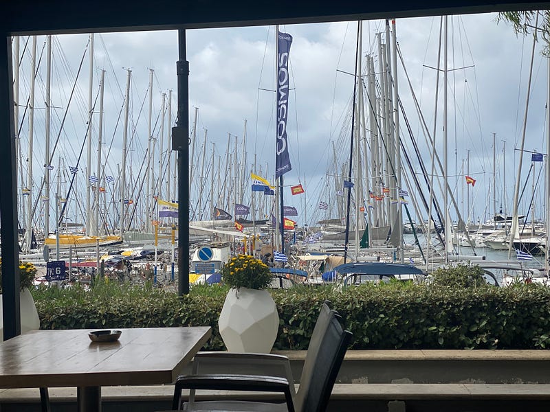Finally, we were back at Alimos Marina again to tour another boat. This time a Cranchi Atlantique 48 (I say “cran-chee” but the broker pronounced it “cranky”, but I also think they don’t have that “ch” sound in Greek, so I have no idea which is correct — I think Cranky is funnier though!). This was exciting as it’s the first boat we’ve looked at where we went “yes, this one would do”. The same broker has another boat (Fairline Phantom 48) which we’ll view tomorrow that’s a little newer, but on paper seems to be an even better fit. It’s nice to view boats that we feel like “this could be the one” instead of the last couple, which we immediately knew weren’t quite right.