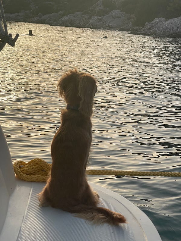 Well that’s been the first week at sea, a rough beginning but overall an awesome experience and one we’ve really enjoyed. We’re finding plenty to do (including a lot of relaxation) and finding no shortage of things to add to the boat todo list! It is very nice to just jump into the water when you’re feeling hot, and we enjoyed a short swim out to the small island with the church. Rosie is whining and barking less at us when we’re in the water, I think she’s getting used to it and not as worried that we are drowning. She has fallen in the water three times now, and we just pull her out, her tail wagging after her rescue.