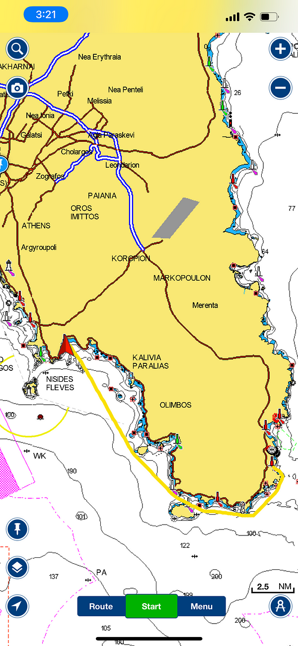 We chose Varkiza as our first anchorage for a couple of reasons. The first was because we’d stayed there for a week a couple of months back — we know lots of boats anchor there overnight and we know where to park the dinghy to get to shore. The second was the app showed that there was good holding (i.e. that the ground underwater is sand and the anchor doesn’t drag) and that the winds were predicted to be very light, so we figured it would be a nice tame first night.