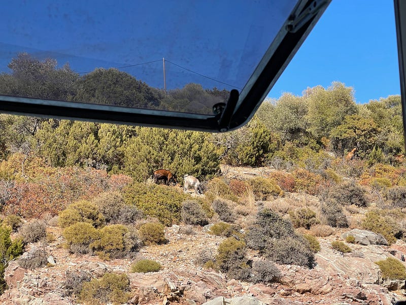 In the evening the goats come out and we can see them wandering around the hill behind us. Rosie has also found other interesting things to watch too — there’s a local man who comes and swims with his labrador some evenings and she’s very interested in that.