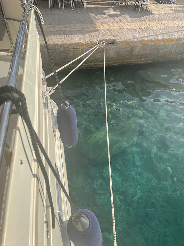 After a day of this, we decided to swap sides and headed out Thursday morning to the south dock in Ermioni where we felt much more secure in even bigger winds — a terrible choice if the wind was NE / E, but coming N/NW? Perfect location.