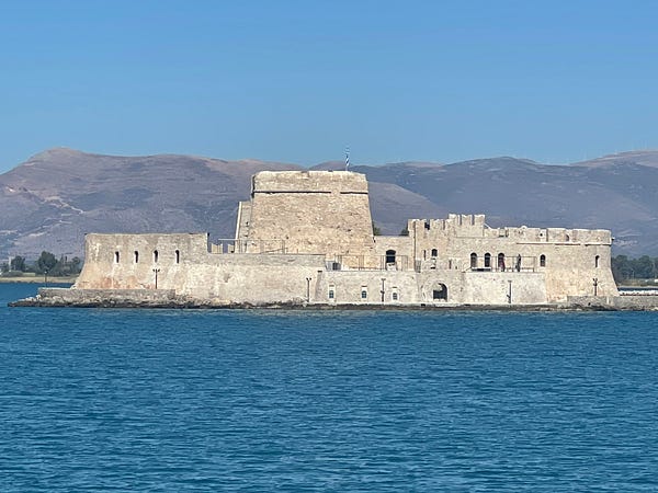 Wednesday we headed up to Nafplio, we’ve been here before, but only by car. We wanted to anchor out again and the prediction was for a North wind, which would have left us very sheltered, but instead the wind persisted from the South and with the swell, it was very uncomfortable. After touring the city for a couple of hours, we decided to abandon the location and docked in a small bay nearby with shelter from the South. This proved to be the right decision and we had a decent night’s sleep.