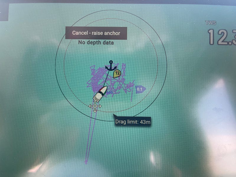 When we anchor out we use an anchor alarm to alert you if the boat moves outside of a certain radius (which would mean you were drifting). The new equipment comes with one built in so we decided to try that out. At 2AM in the morning the alarm went off — the boat was suddenly 20 meters outside the circle. I looked and we hadn’t obviously moved at all, there was also no wind or anything that would cause it to happen. Five minutes later, we jumped back in the circle and the alarm went away. I followed up with the mechanics and he said it was because of the old GPS antenna which takes too long to re-acquire satellites in overcast conditions and loses accuracy in those circumstances. Fortunately this is one of the items on the upgrade list which was arriving this week.