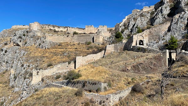 On Sunday we headed to Corinth, yet another of the myriad ruins in Greece and one that’s very impressive both in history and scale. It’s broken up into two sections — Ancient Corinth, which is the older, original part and then Akro Corinth, which is the settlement on top of the huge Acropolis that was inhabited right up until the 19C. For the biblically inclined, one of the claims to fame here is to visit the house that St Paul stayed in — I’d never really thought about it to be honest, I’m passingly aware there’s a section or two in the bible called “Corinthians”, but I hadn’t put the obvious together which is that St Paul lived here, and later, was writing letters to the fledgling church with advice.