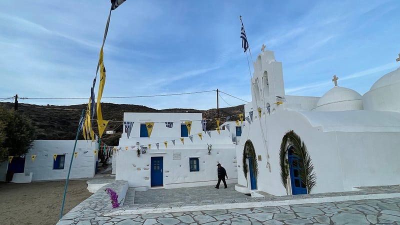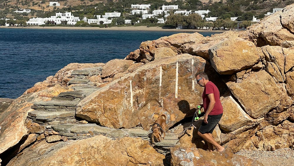 As we continue our adventures in the Cyclades, it’s been a surprisingly social experience! On Sunday afternoon in Sifnos — Voula, a boat pulled in beside us and I helped them tie off stern to. We recognised the man Bruno and his wife Séverine as a couple we’d shared a taxi ride with from the Chora on Kea, so we invited them aboard for a drink.
