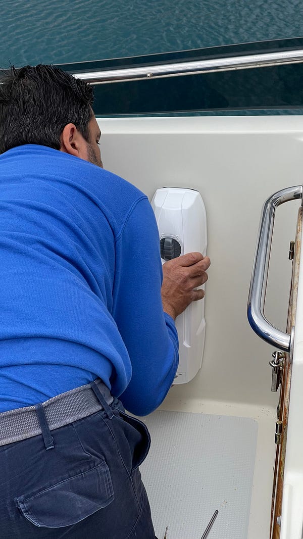 Friday morning the mechanics arrived and finally one of the first tasks required by our insurance from way back in May was completed! We now have a functioning AIS Class B Transponder! AIS (Automated Information for Ships) lets you see other boats electronically — tracking their position and speed on the sea. We’ve always been able to see other AIS equipped boats, but until Friday, we weren’t broadcasting our own position. Now we do! It’s very useful for other vessels to be able to not only easily see us, but also to know exactly where and how fast we are heading.