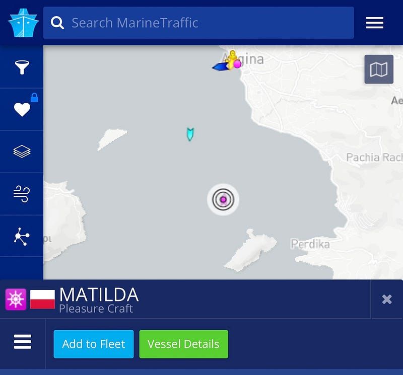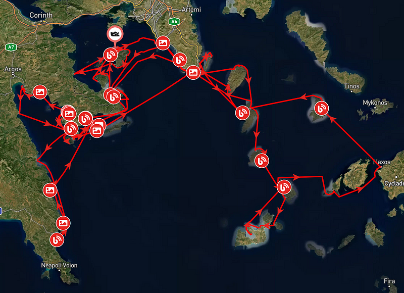 We left a little after 7.30pm which was pitch black and headed to the north of Kythnos. At least here the seas were calm as the water was protected by the island from the south, but as we turned across the north of the island and started to head towards Athens, we were exposed to swell from the south which made for a very uncomfortable journey. As always Matilda handled it like a champ — there’s a big difference between unsafe and uncomfortable, she just charged on through the night, waves crashing onto the bow without missing a beat.