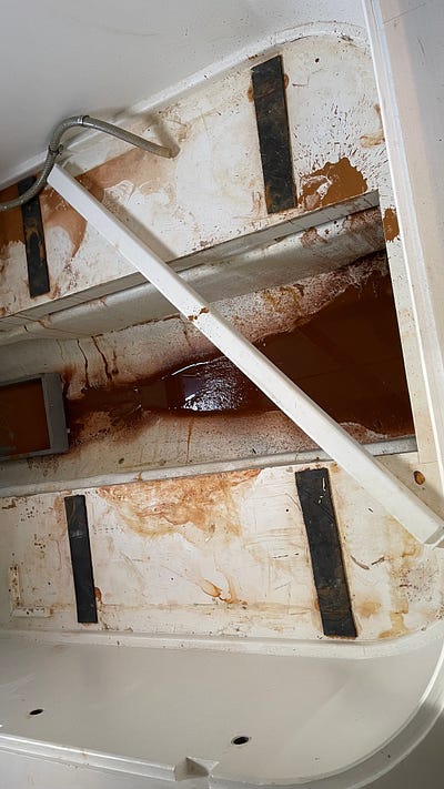 I was at the shipyard on Aegina on Thursday where I caught up with the mechanics to plan out exactly what we wanted for the air conditioner and to check the progress. We discovered that our previous water tanks (as well as leaking) had also not been connected up properly — there were two with the bottom one gravity fed from the top one, but the freshwater pump was pulling from the top, which meant the bottom tank was full of water (and mud) that was never drained. Gross. Also a big mess made in trying to empty it and get it out!