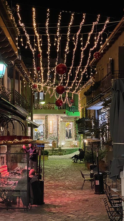 Arachova, just before Delphi, is one of the best (worst?)examples of this you’ll come across. It’s the gateway to Mount Parnassus and the ski slopes of Greece so it’s the playground of the rich and famous (not that we know anyone like that here in Greece). It’s ridiculously cute with a real “apres ski” vibe. Christmas lights, little bars and fancy restaurants line the main road.