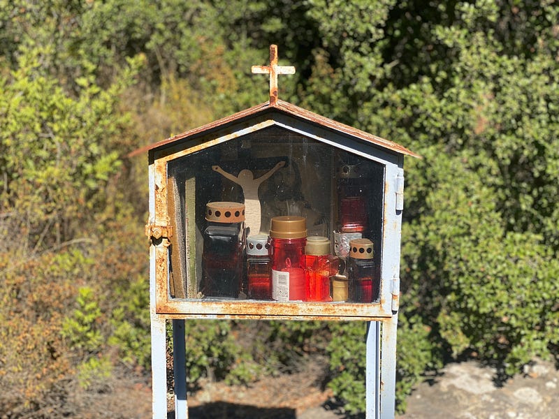 You also get a sense of the history! These streets were not designed for cars. Fortunately there’s not much traffic, but frequently inside towns you’re negotiating two way roads with only enough room for one car. The guys from Athens call it “Island Driving”. We also saw lots of small shrines alongside the edges of the roads, it turns out these are devotions to people who have either died in a car accident, or perhaps had a serious accident and survived. In Australia the equivalent would be the bunches of flowers tied to a tree by a highway. They are very frequent and definitely a good reminder to slow down (although the locals don’t seem to believe in this-we saw lots of overtaking on double lines).