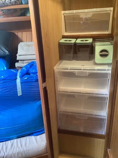 - Water system — Remove old stainless tanks which were leaking, replace with food grade plastic tanks, ceramic and carbon filters fitted in the kitchen (so now we have drinkable water on board!!!), all the taps replaced, water maker added (so we can convert sea water to drinking water underway) and fitted with a shore attachment (so we can convert crappy island water to drinkable water in port).