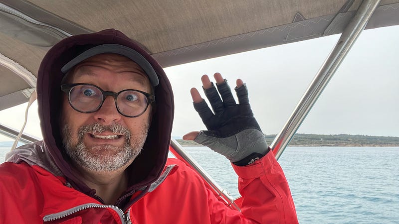 Immediately after we start the motors an engine alarm goes off! The motor is overheating, so I put it in neutral, call up Elizabeth who had gone down into the cabin to make lunch and then we cut the engines and put the sails out again. We’re not going fast at all, roughly 1–1.5 knots in a very light wind, but at least we are making some motion, we can control the boat and we’re heading away from land.