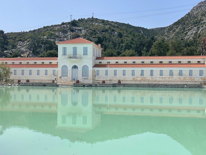 On Saturday we cruised back to Aegina, this time stopping off at the port of Methana, somewhere we’ve only ever bypassed on our way to and from Poros. It has poor reviews which are perhaps somewhat unjustified — the port itself is clean and pleasant enough, not particularly romantic or quaint, just functional. There’s just nothing to “do” there. Its claim to fame is the hot springs which as best we could tell have stopped running. We walked up to the north end of the bay where there is a small church and we could see a dried up spring that probably had hot water in the past. Then we went to the south end where there are famous sulphur baths that the reviews claim smell like rotten eggs. There was strangely coloured water and an impressive old bath house, but no smell and no hot water there either.