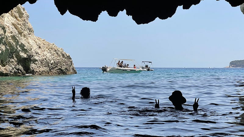 Then it was back to Zakynthos, but this time we headed to the North side. We found a lovely sheltered beach to anchor out at. Just us and 100 people on shore slowly baking like lobsters. The weather has been getting a lot warmer, the water is generally around 27–28C now and the last couple of days have been 38C on land. Being able to pop in and go swimming when we like really helps.