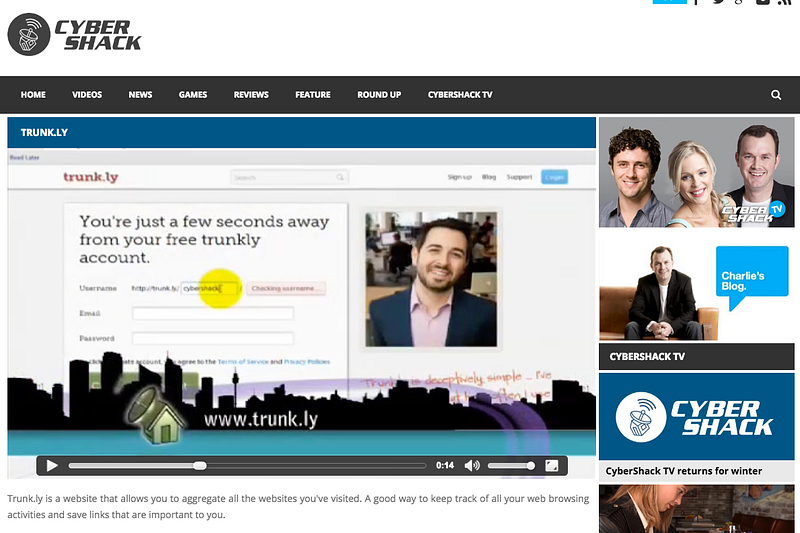 I was on Twitter over the weekend and a friend mentioned they’d just seen Trunk.ly mentioned on Channel 9 (National TV station here in Australia). This was a complete surprise! We were never contacted to comment or contribute. Usually we have to fight and scrap for a mention, but here’s a tech TV show plugging us because they think we are interesting. Here’s a link http://www.cybershack.com/tv-episode/trunkly.