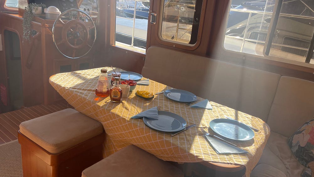 We joined Claire and Ollie on their boat Thursday night for a delicious lasagne, and invited them for a pancake breakfast today (Sunday) which was a lot of fun including a walk in the wonderful morning sunshine.