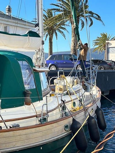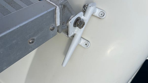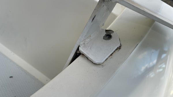 The passarelle is getting a bit more of a work out than usual — we’re at dock all the time and crossing it several times a day. Karina noticed it was wobbling more than normal and we saw that several of the screws attaching it to the boat have sheared and need replacing. After looking at and thinking about it, we’ve reached out to the professionals at Navar. The way it was attached was very much a home made job and the screws holding it into the fibreglass just heavy wood screws, it’s a wonder it lasted as long as it has. They’ll come by this week and design a custom stainless steel bracket which will be fabricated to hold it, then when that’s ready we’ll take Matilda over to Navar and they will remove the old bracket, make fibreglass repairs and paint then attach the new one.