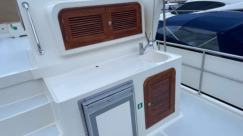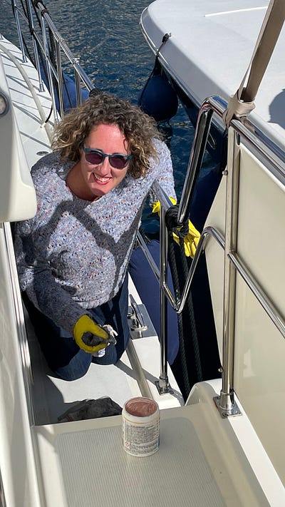 Several major milestones have been accomplished. I’ve completed the varnishing and Karina has finished polishing all the stainless steel rails. While the varnishing doesn’t look radically different, it’s fixed the peeling that was starting to appear everywhere and in several places around external doors the exposed wood now has several protective coats in place again.
