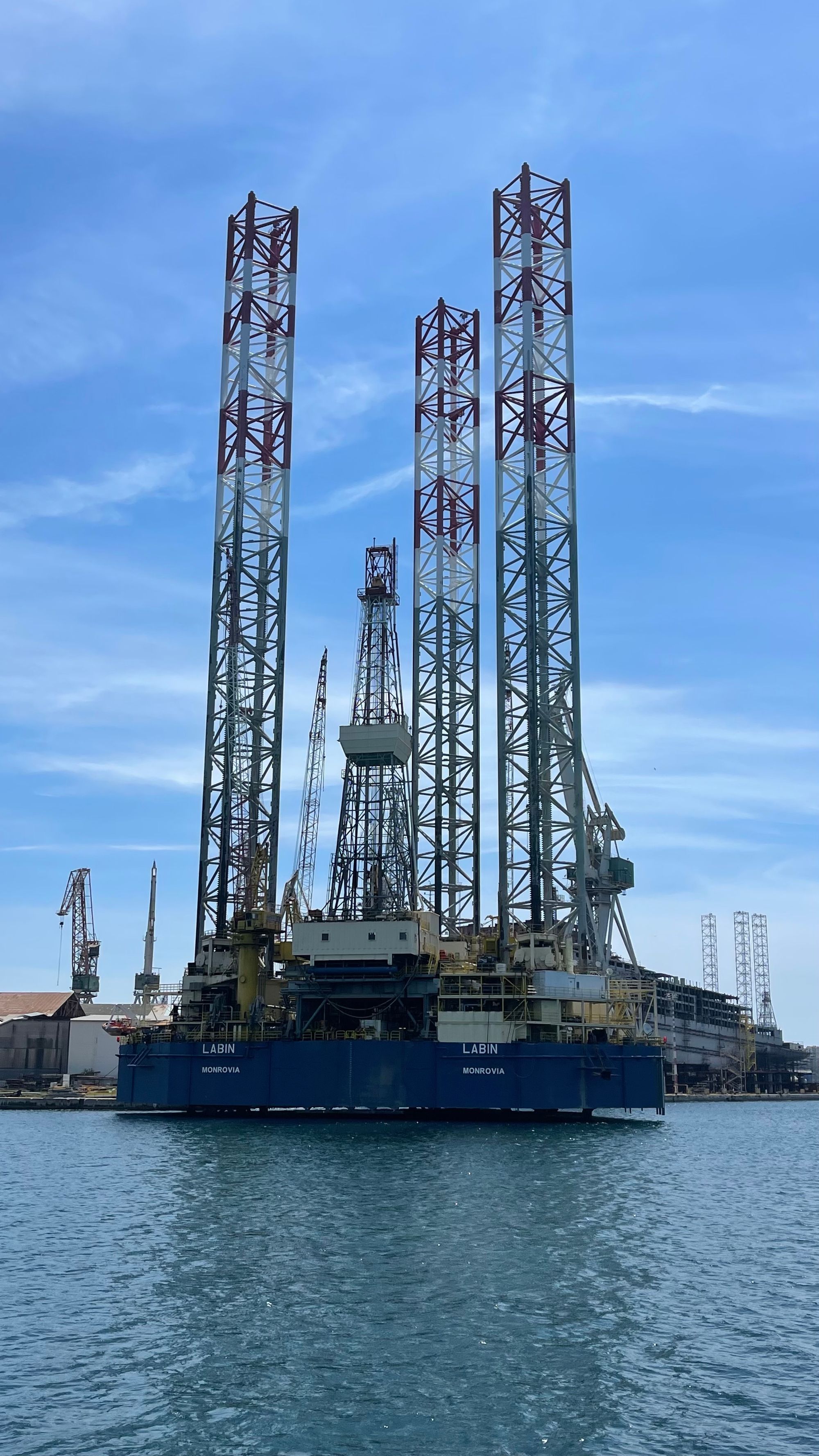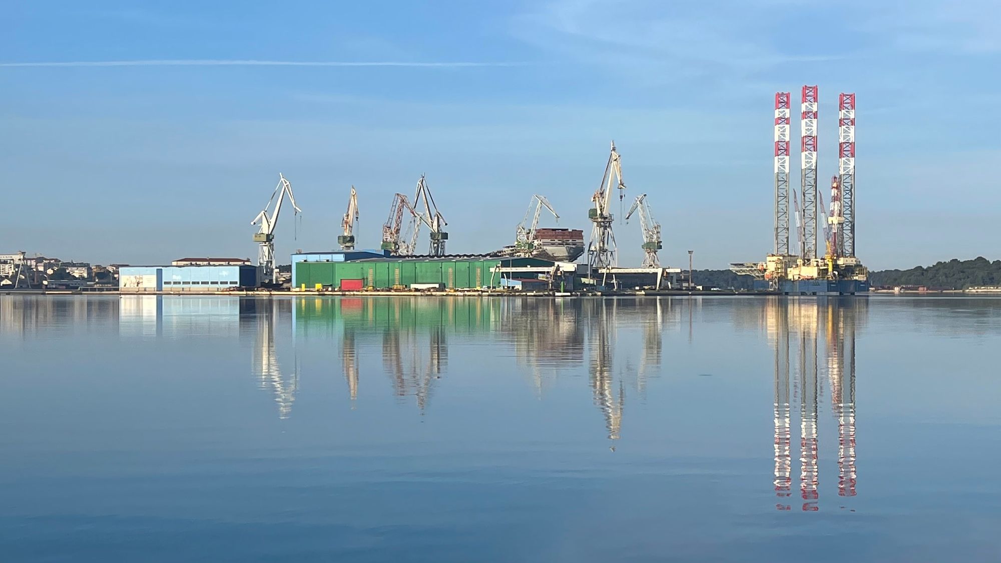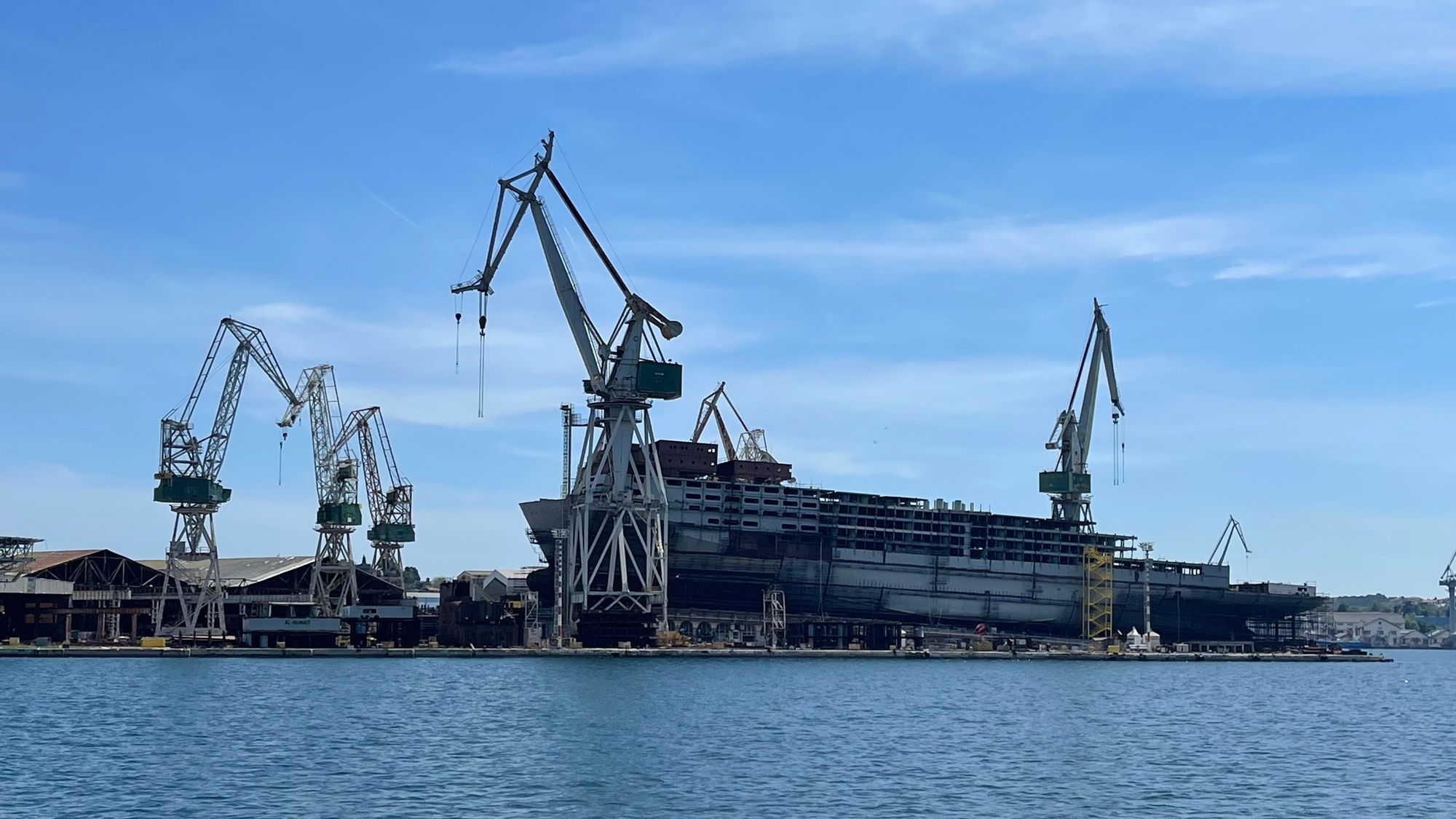An old Austro-Hungarian ship yard, it went into bankruptcy back in 2019 and it seems the shell of the boat they were working on is still there, not completed. It's created a lot of local unemployment - the ship yard was the biggest employer on the Istrian Peninsula. There's also two huge drilling (oil?) rigs sitting on the shore that don't seem to have been moved in a while, they are both on Google satellite photos.