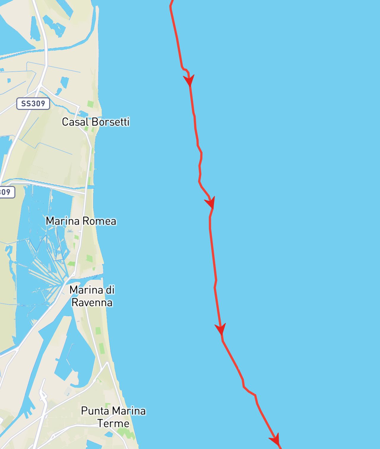 Still scarred by the earlier journey through the logs, and also with the weather a little rougher (mostly swell rolling in from big winds over near Croatia), we decided on a shorter 2 hour hop to the town of Cattolica. It was a good call. The ride was uncomfortable and the logs still an issue (although improving).