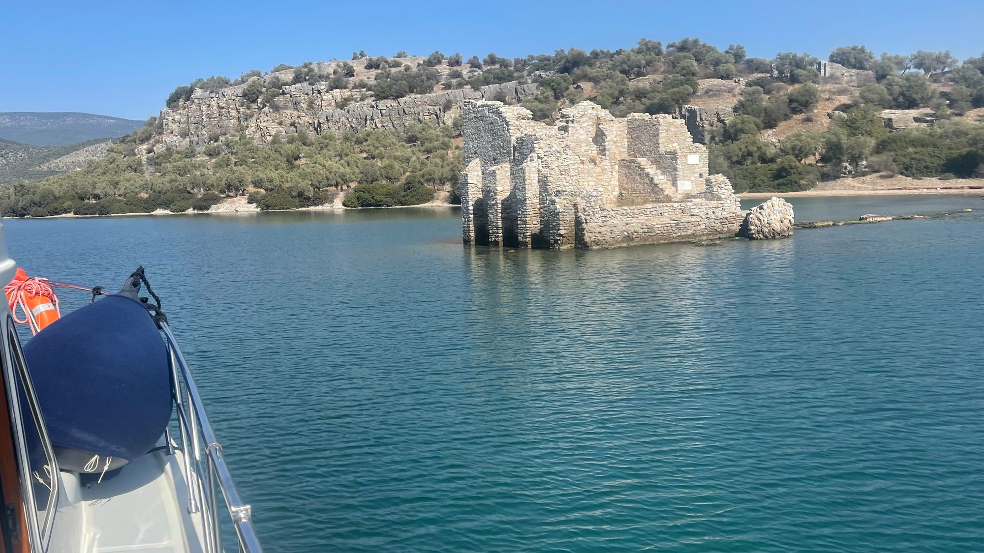 One of the neat things about this coast is all the old ruins around. This is an ancient Greek tower (2,000+ years old) that guarded the entrance to Iasos. Very cool that we got to cruise by it. The ruins of the old city are on the hill behind; they are still being excavated and explored.