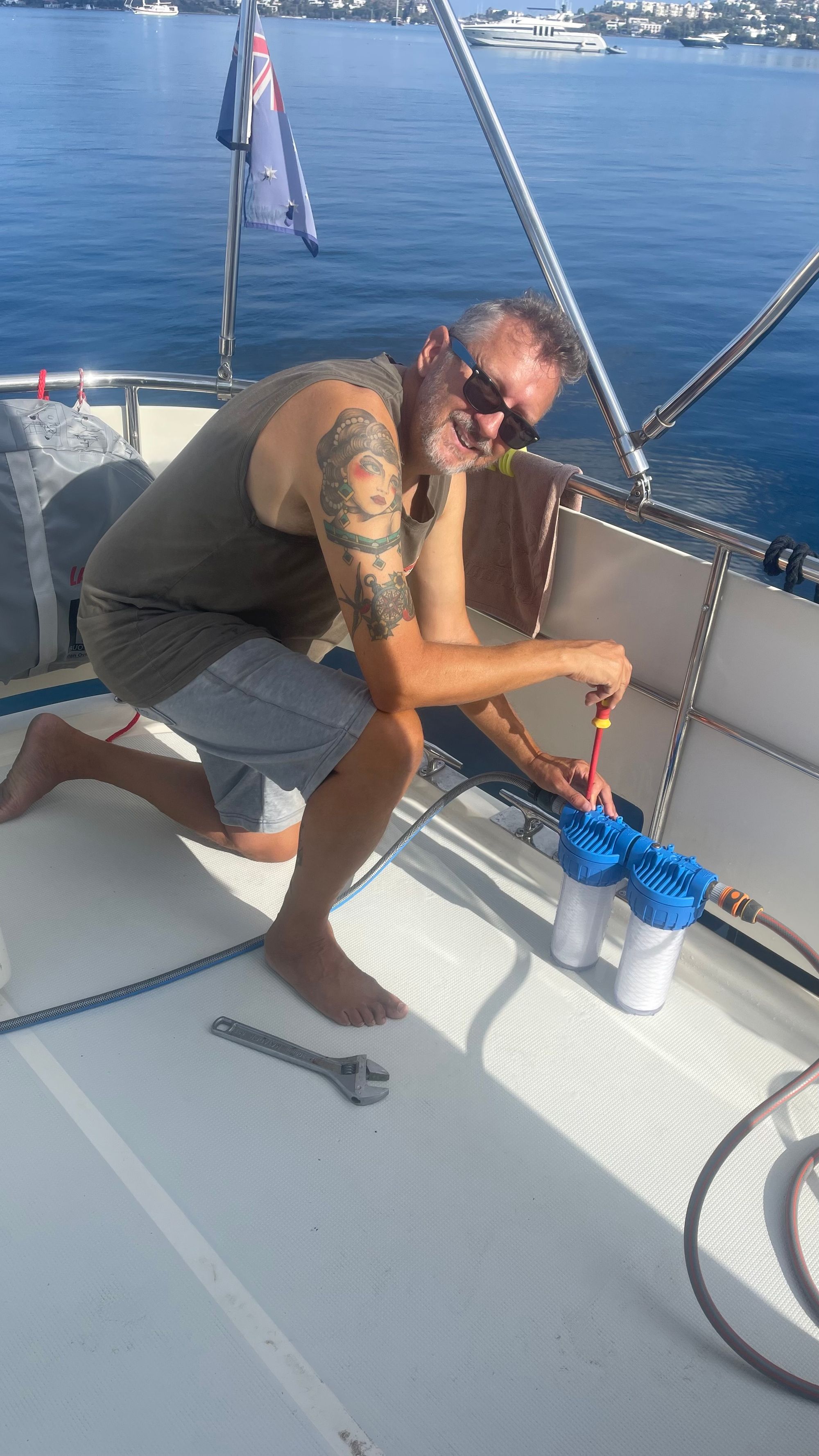 Scenes around Yalikavak. A while back (in Mytilene), we bought an external water filtering system but had yet to use it because of our watermaker. Well, now we need to use it. It helps keep crap out of the tanks when we fill them.