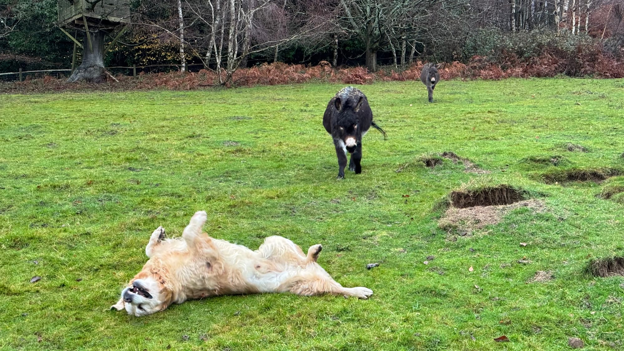 After a lot of wet days, the weather finally lifted a bit on Monday and Tuesday, which allowed us to get out of the house more, too. We continued to explore the estate and enjoy the facilities of the house. One amusing encounter was rambling through one of the fields, and a pair of dwarf donkeys came over to say hello. We'd been warned that they might be around, and they were both very familiar with the dogs, so there were no issues there.