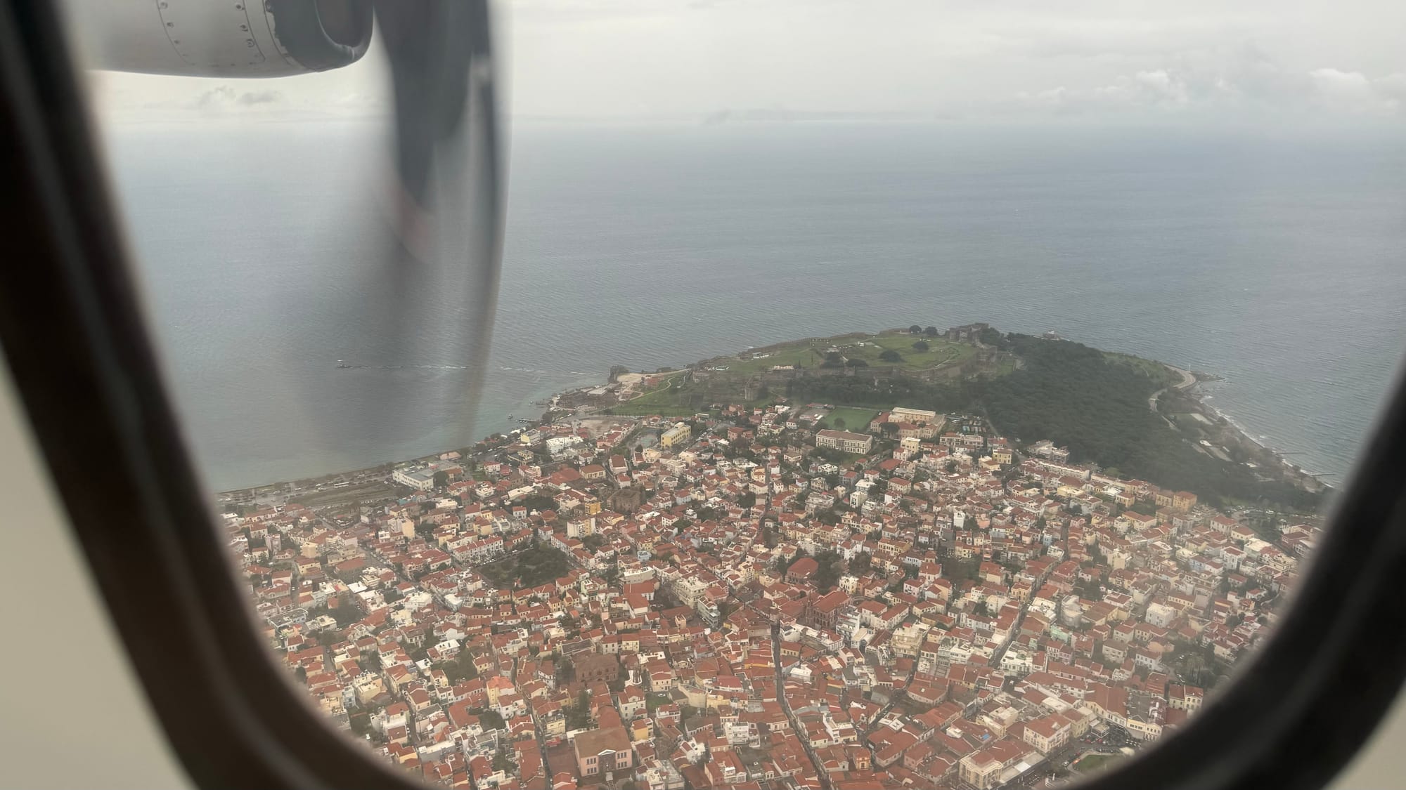 Flying into Mytiline. Still wet here. The loot from the trip - we bought back a suitcase full of goodies that are hard to get in Greece.