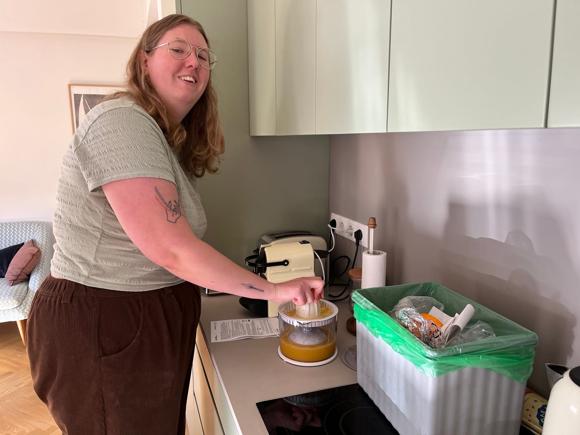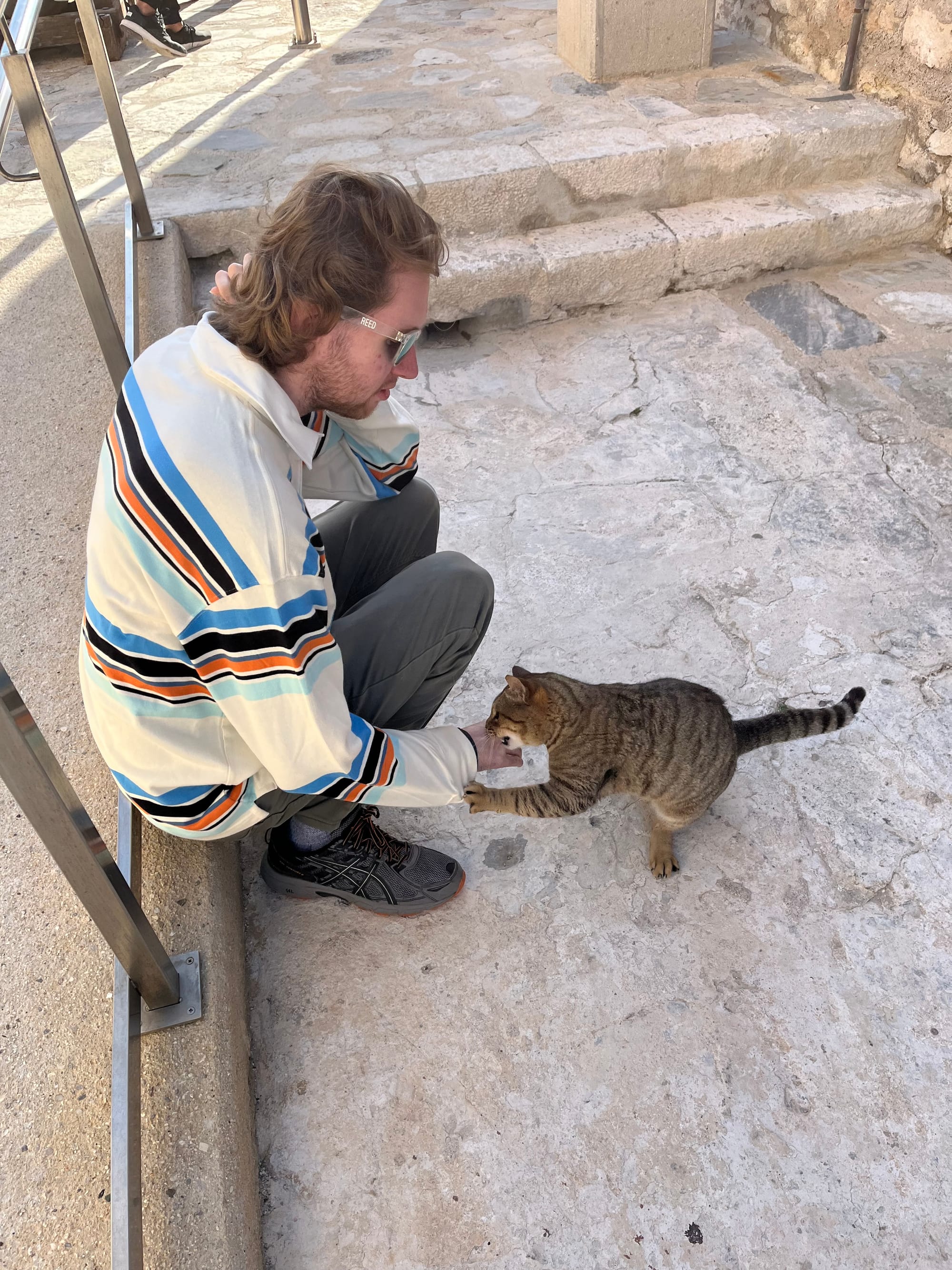 Ella squeezing oranges, Epidavros, and Jasper at the moment he got bitten by a stray cat he was trying to pat.