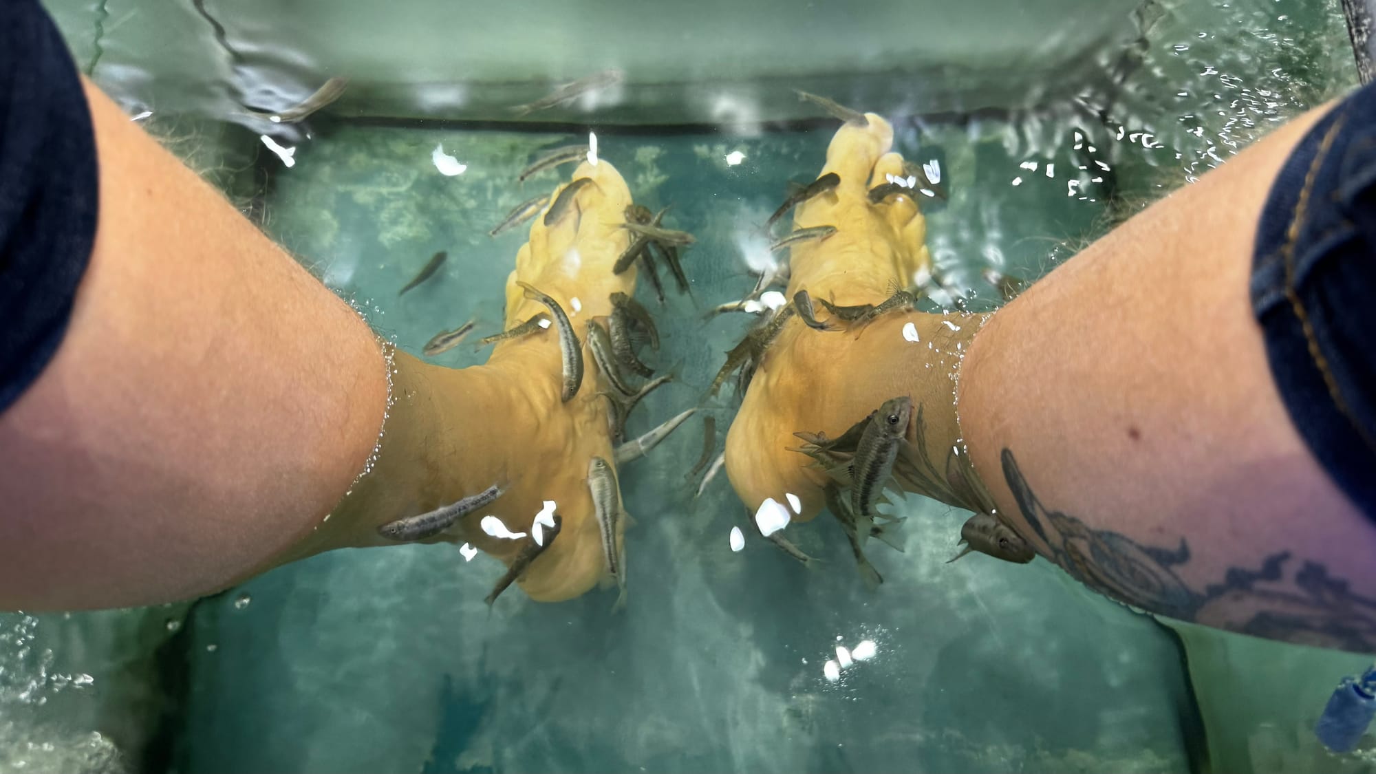 Visiting the Fish Spa. Jasper with his Mac'N'Cheese.