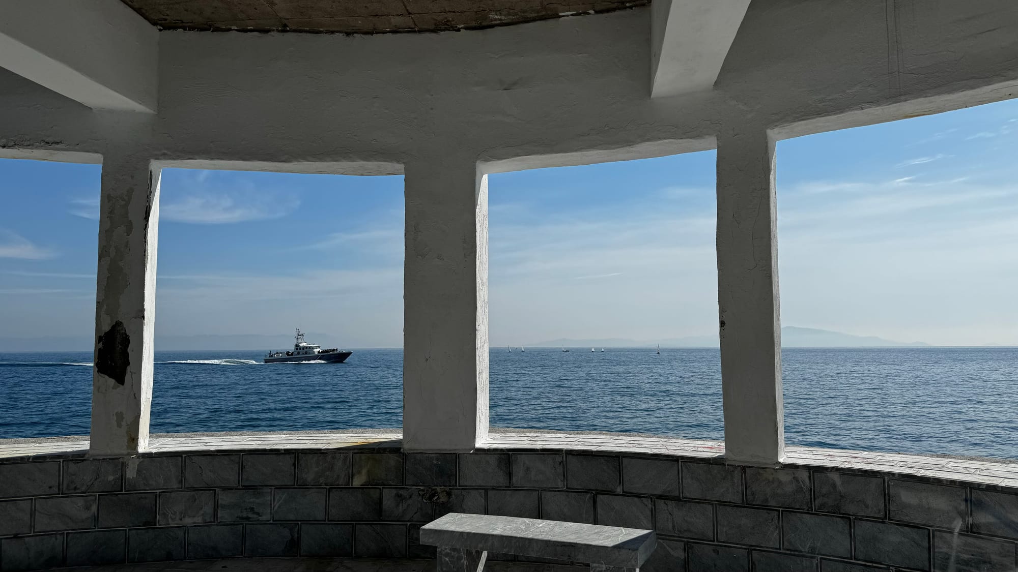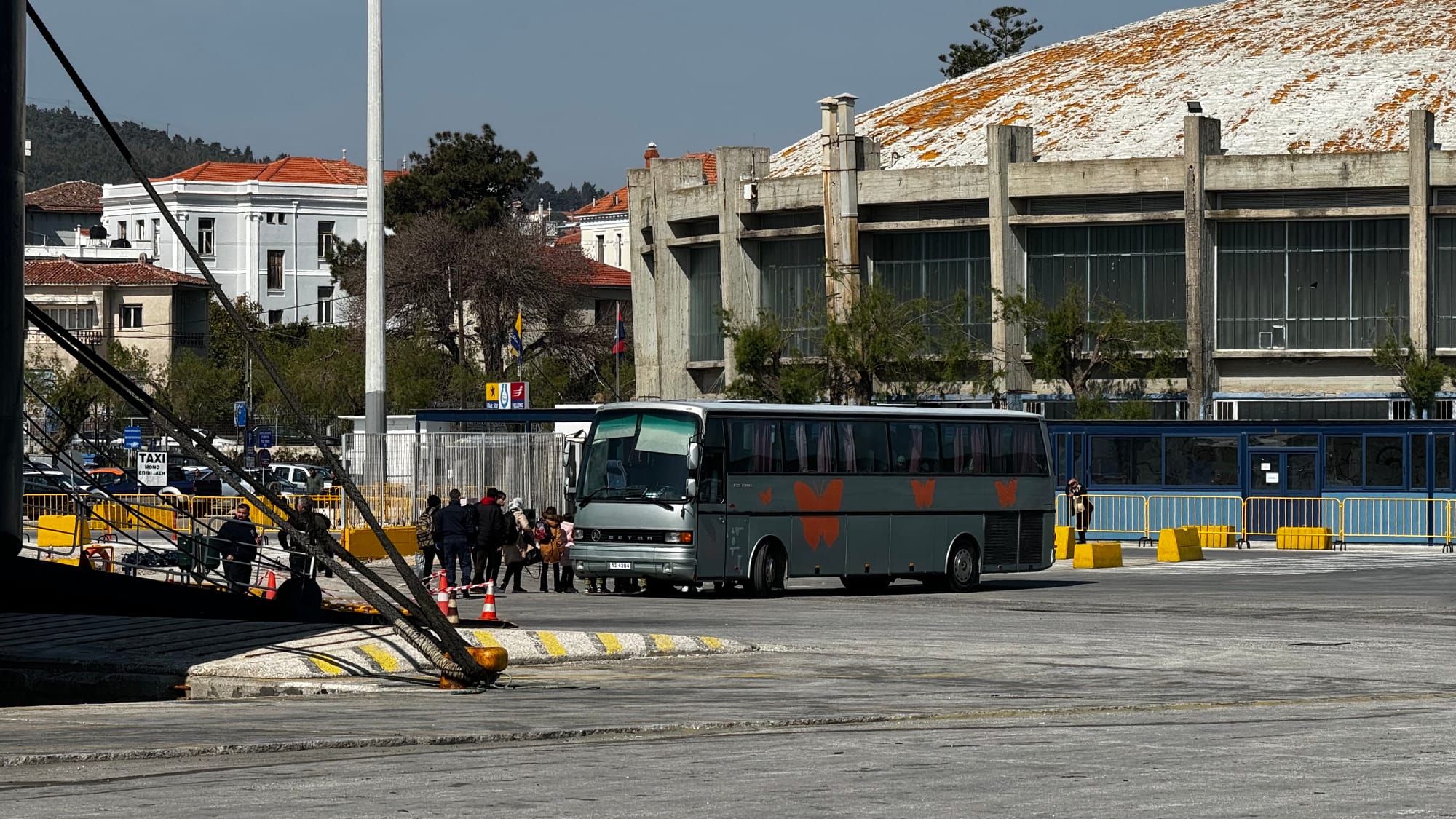 It was a smooth operation – by the time we'd walked the ten minutes back to the end of the mole, the coastguard boat had unloaded, the refugees were on a bus and it pulled out to take them to the camp north of town.