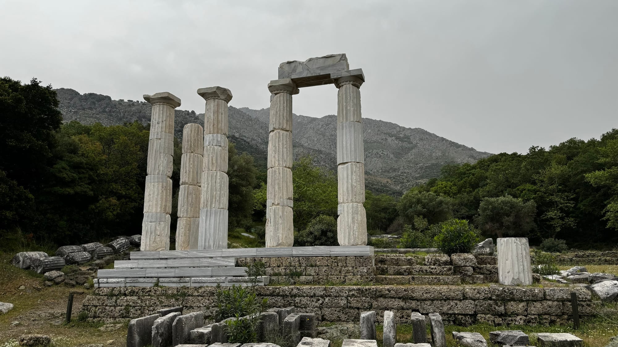 Samothraki is famous for one particular historic site, the Sanctuary of the Gods, which is a cult centre that was famous in Ancient Greece for a few reasons. It had a "mystical" joining ceremony that was very secret. Not a lot is known about it—it's known that there were at least two levels of initiation, that the second level was occasionally deadly, and that the initiates wore red belts to signify their status.