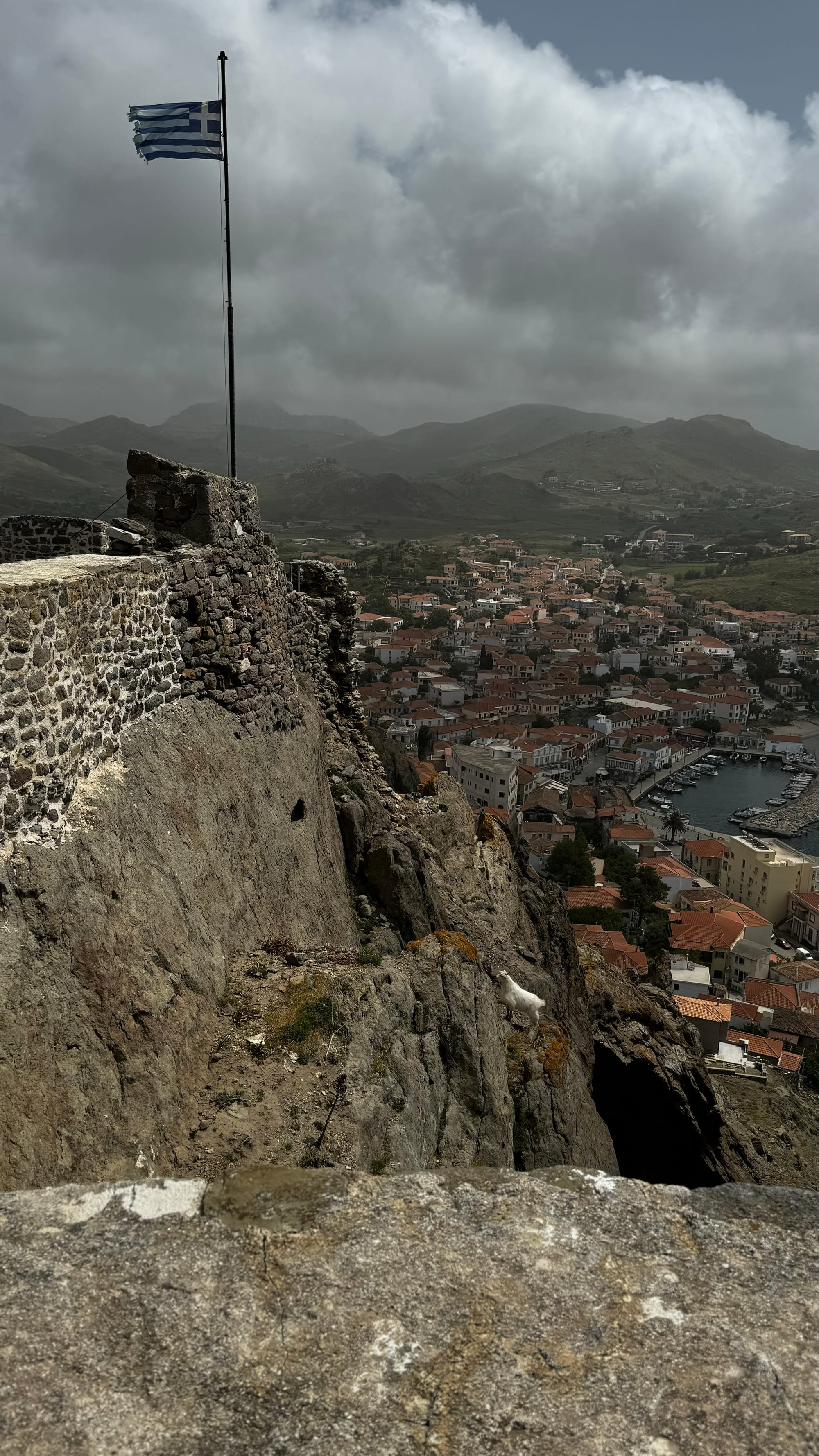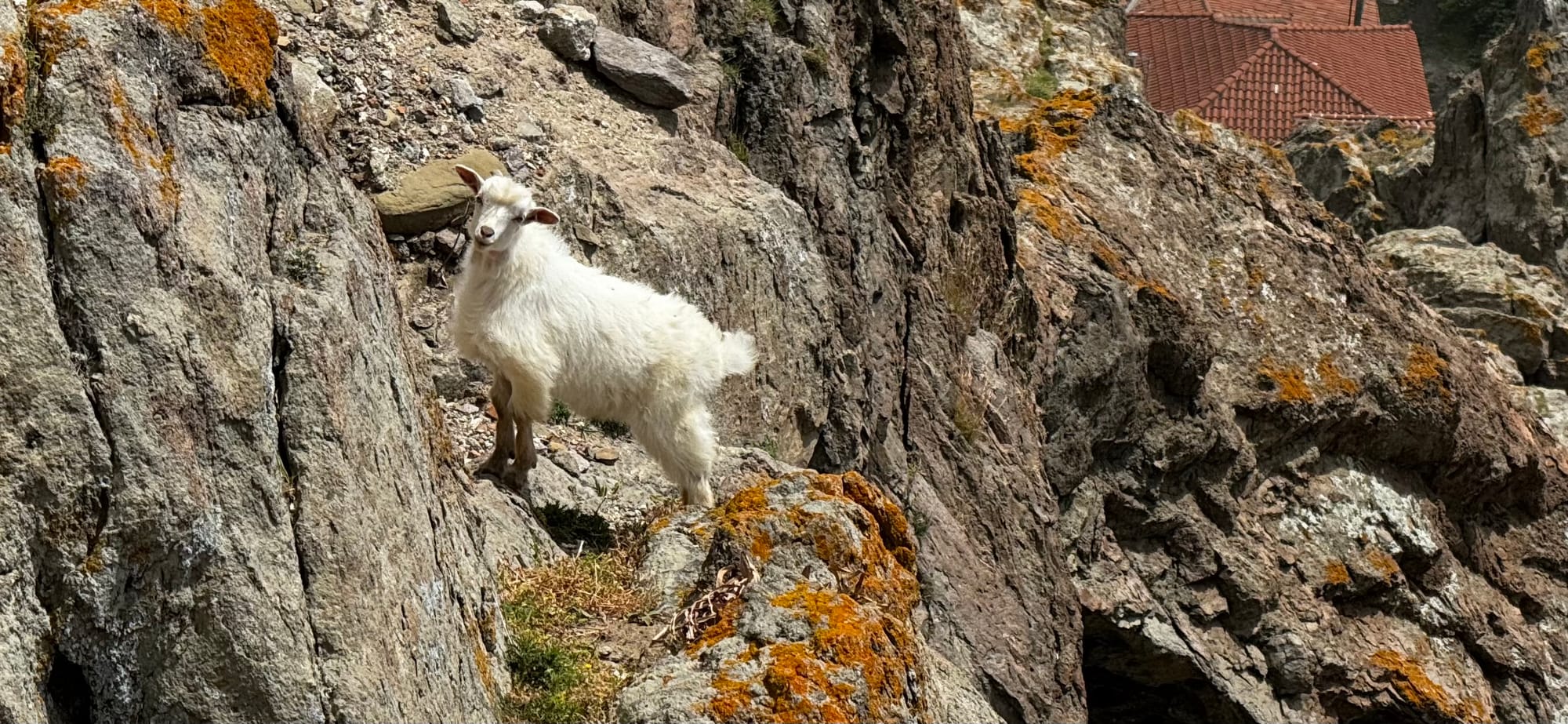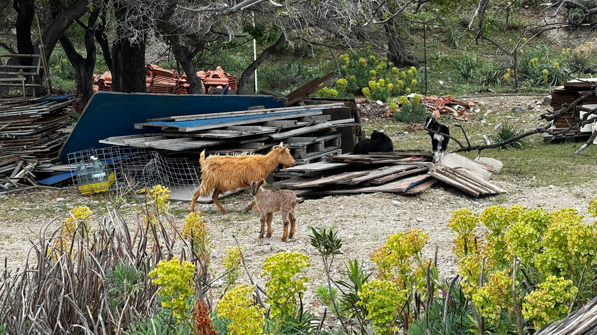 After all this, we pushed on to the end of the island. The road deteriorated more and more. It is poorly built right on the edge of the sea, and large sections are washed out and collapsing. There were also goats everywhere. Samothraki really is the island of goats – and kids! With spring, baby goats are everywhere. We had to drive carefully to avoid them.