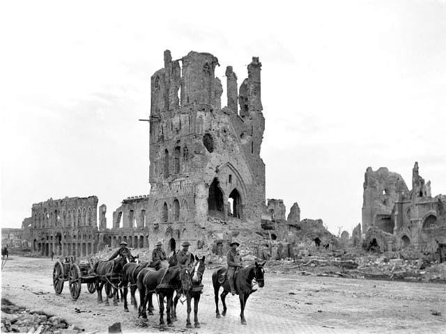 The black and white photo is the cloth hall in Ypres during World War I, the right, fully restored.