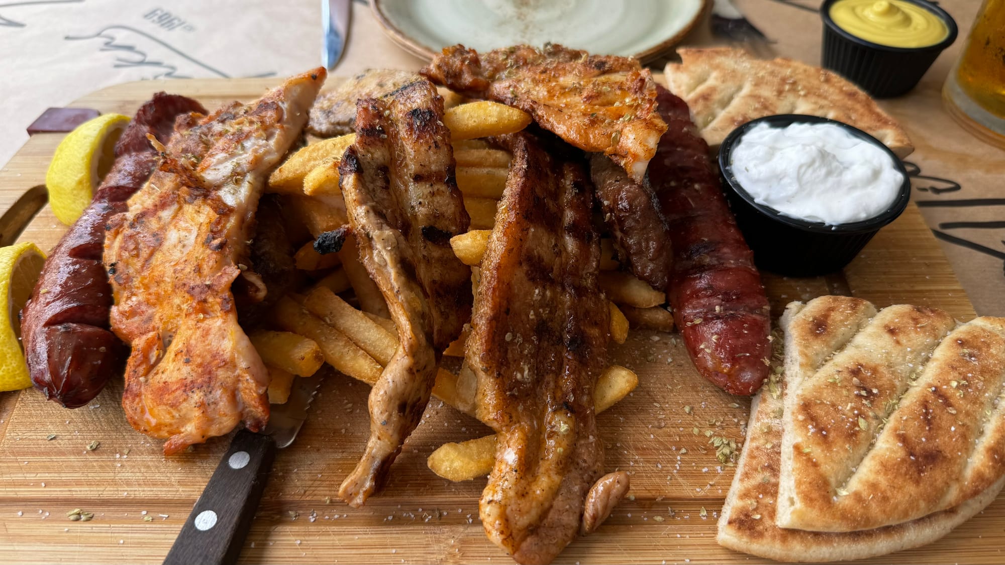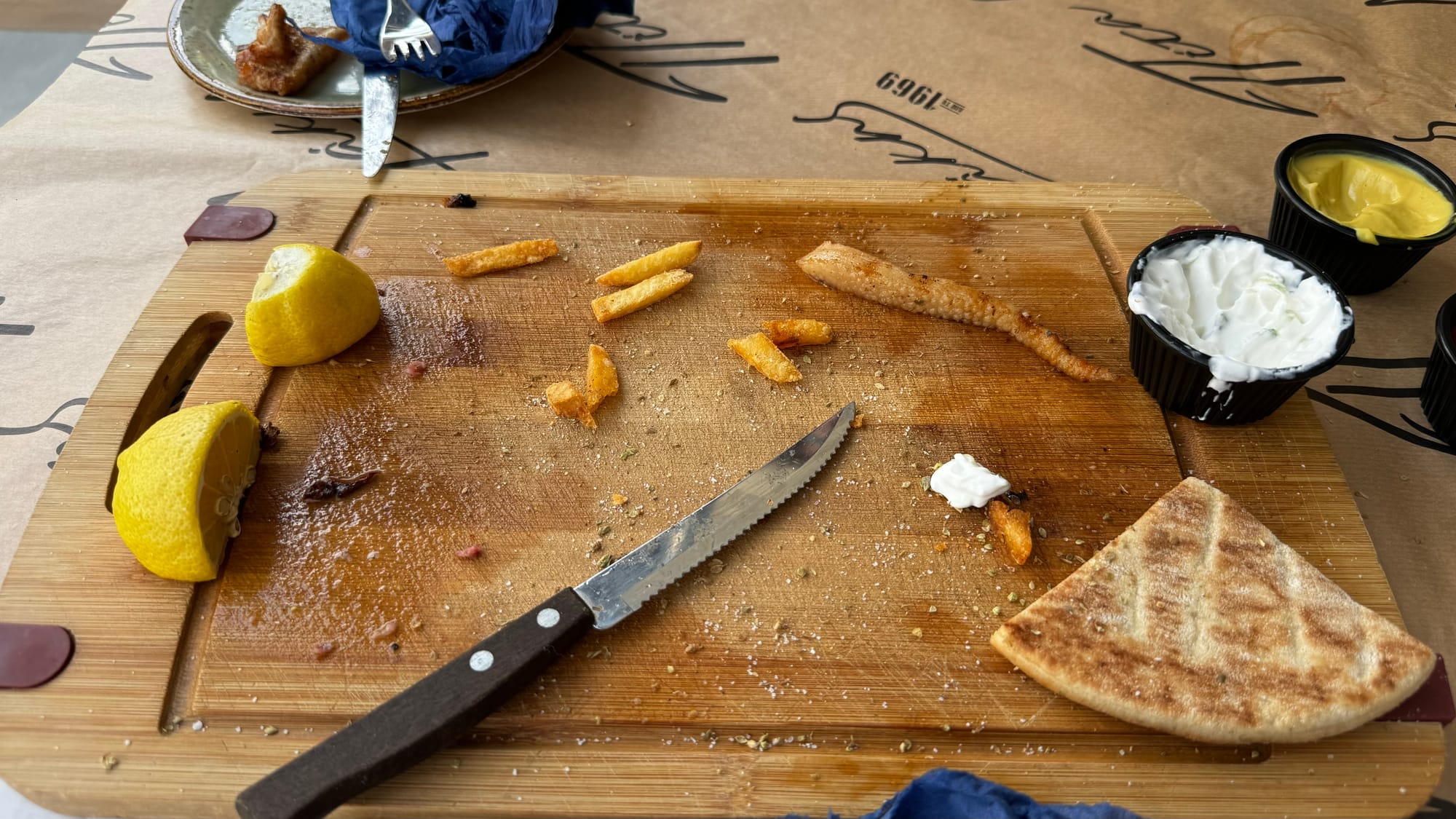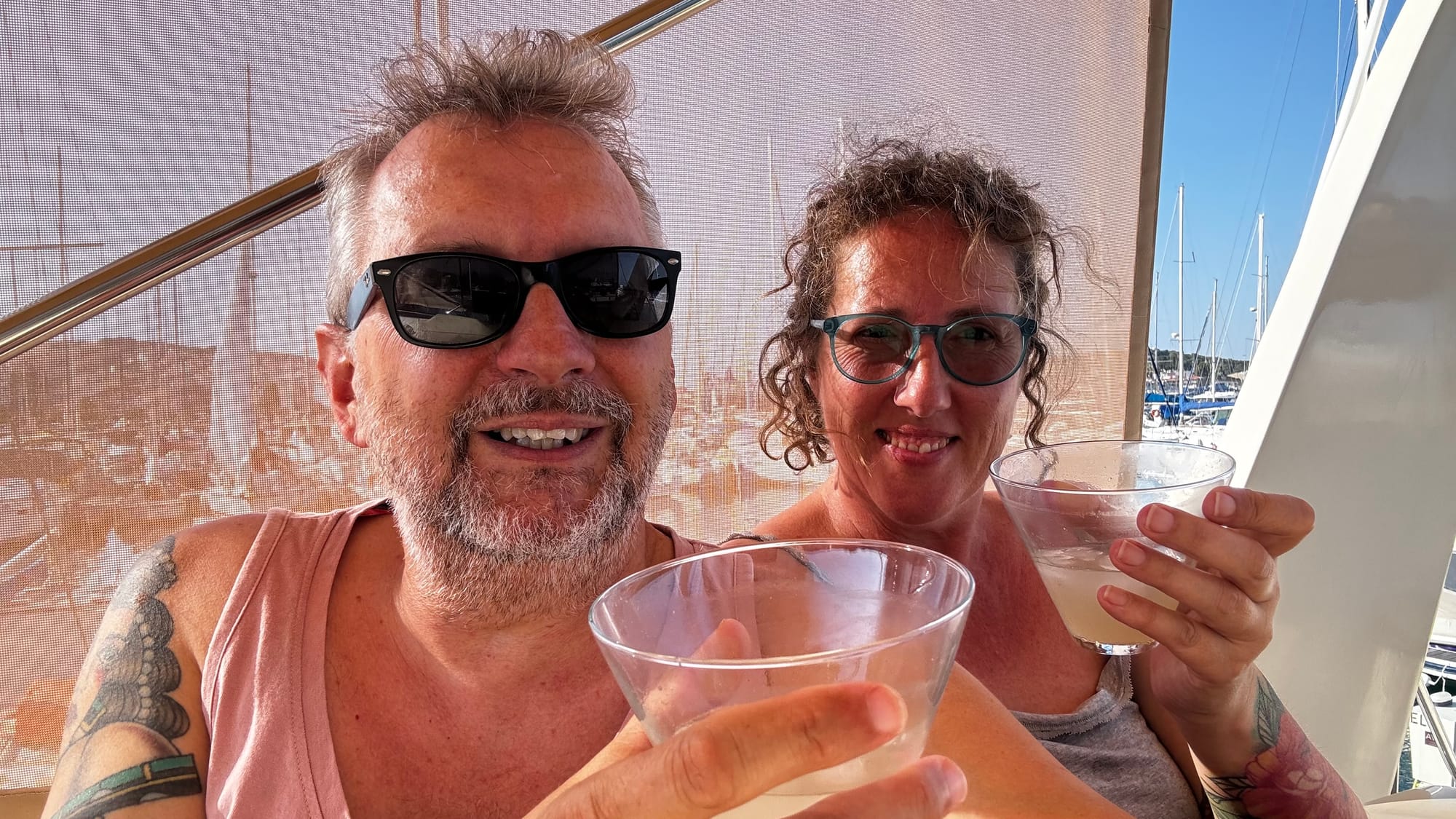 Margaritas on Matilda, the last for a while. Upside down, trying to diagnose the rear bilge. Our last mixed grill in Greece.