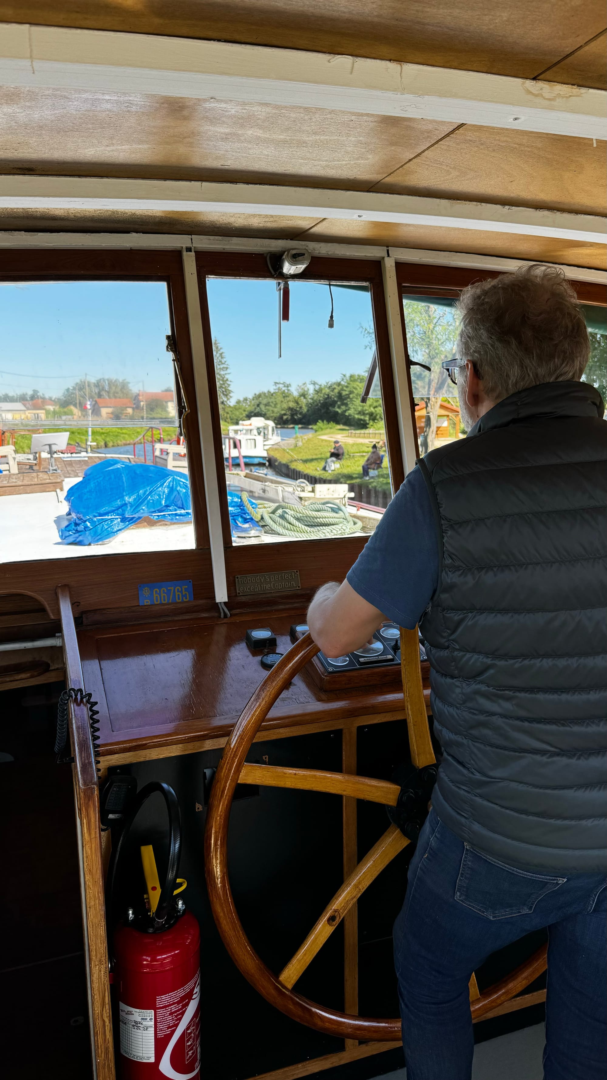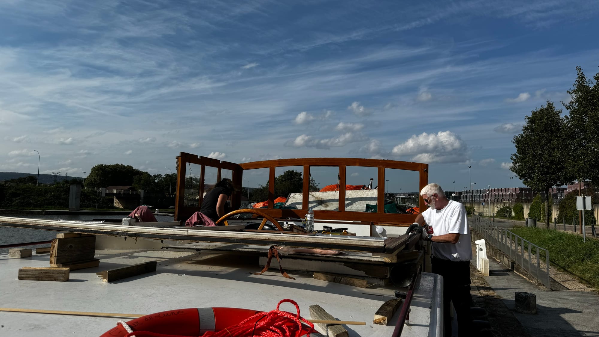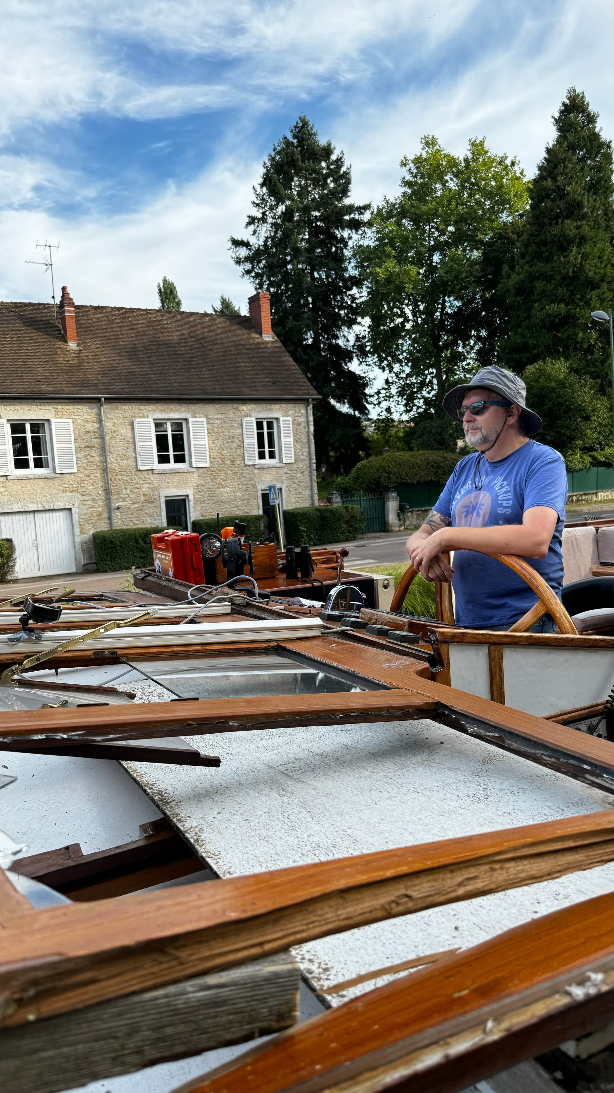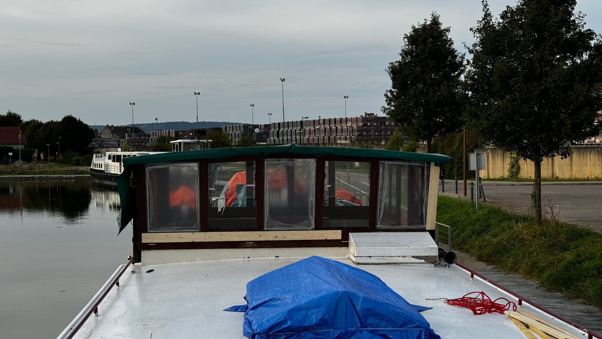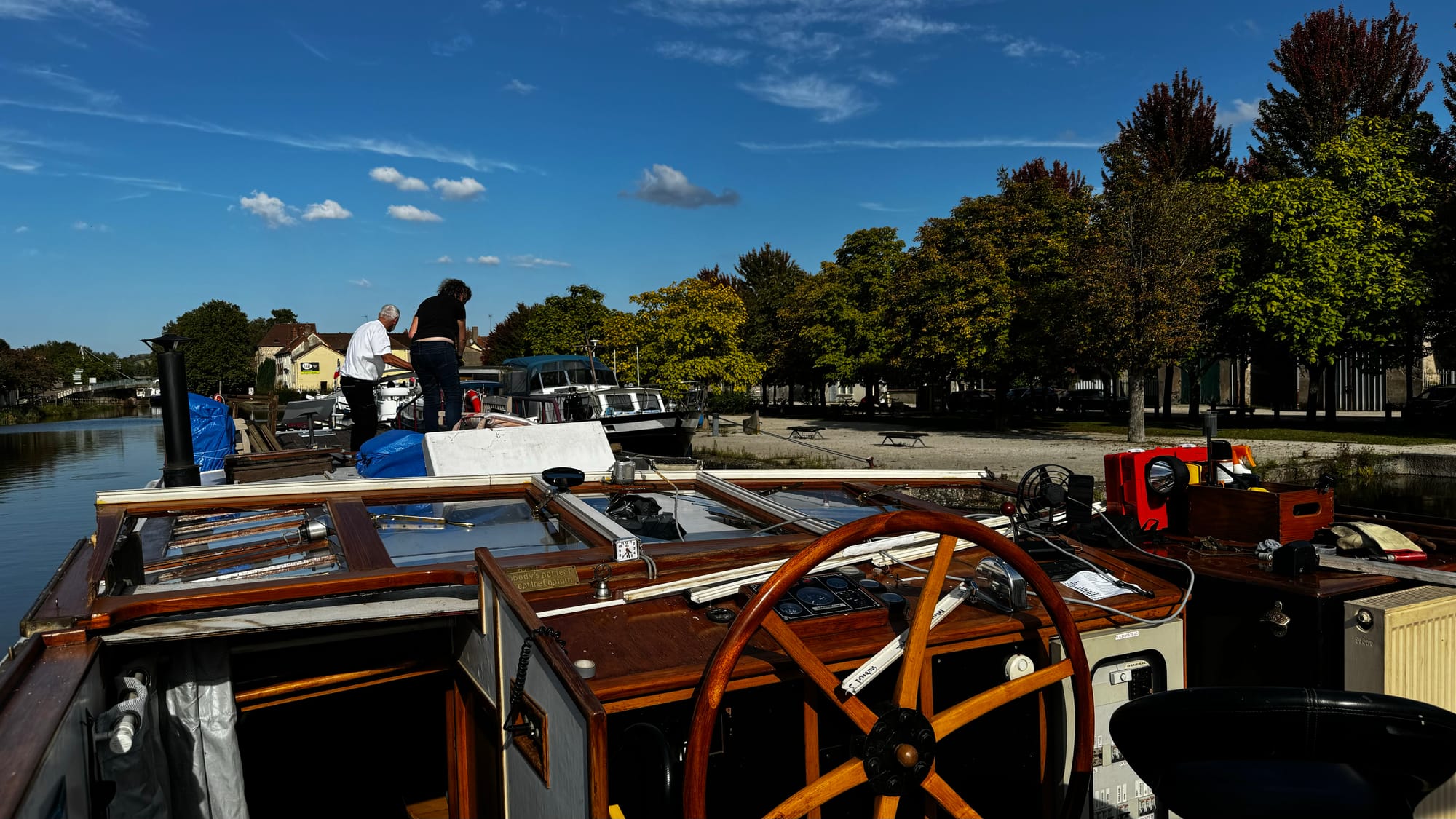 Paul took over steering to save us time as darkness was approaching. With the wheelhouse disassembled, our nav lights didn't work, and we needed to get onto the quay. A smaller plastic rental boat overtook us on a slow corner and immediately stopped and moored, causing extra stress and an emergency break on our part. Clair de Lune is NOT an easy boat to stop. When she's going forward, she will happily continue in that direction for a very long time. If you're navigating in close quarters with a 100-ton steel boat on a narrow waterway, be patient! It's not us that's going to get squashed.